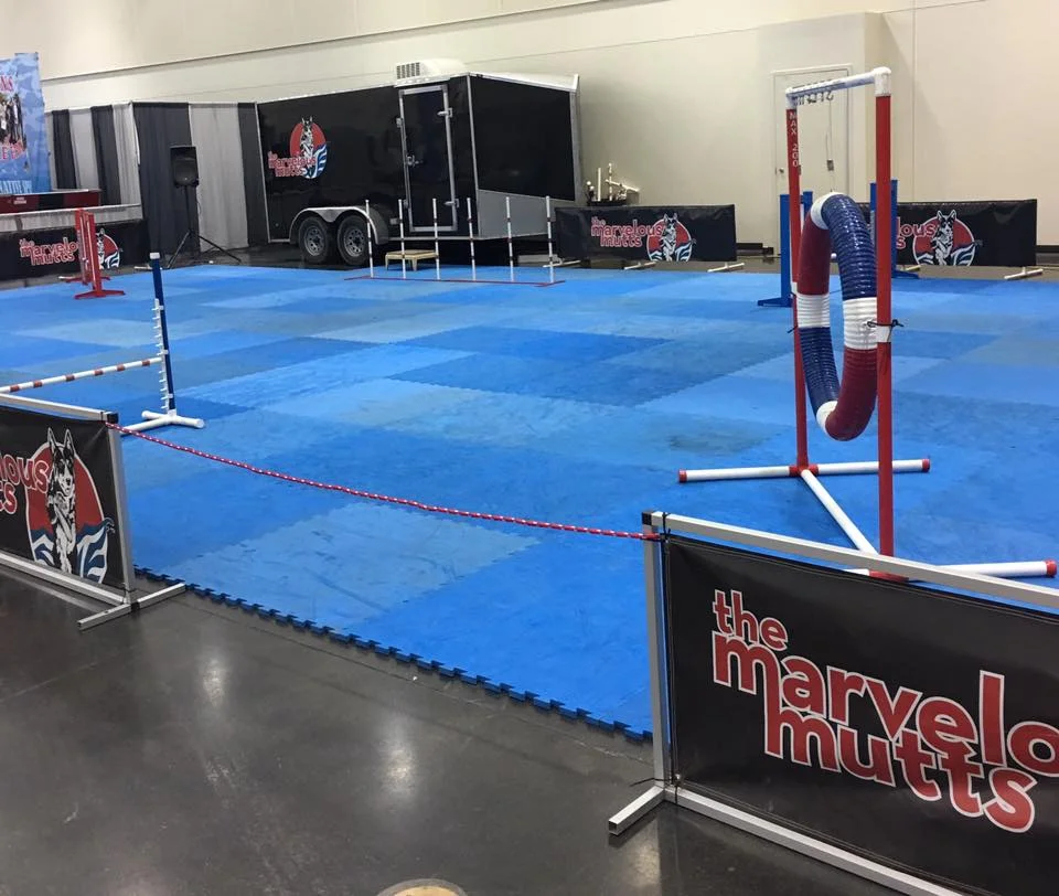 With multiple teams, and flexible equipment arrangements, we provide canine entertainment in all kinds of spaces. This weekend is a great example of this, with our full outdoor setup in Glendale, AZ, and a smaller-footprint indoor setup in Erie, PA.